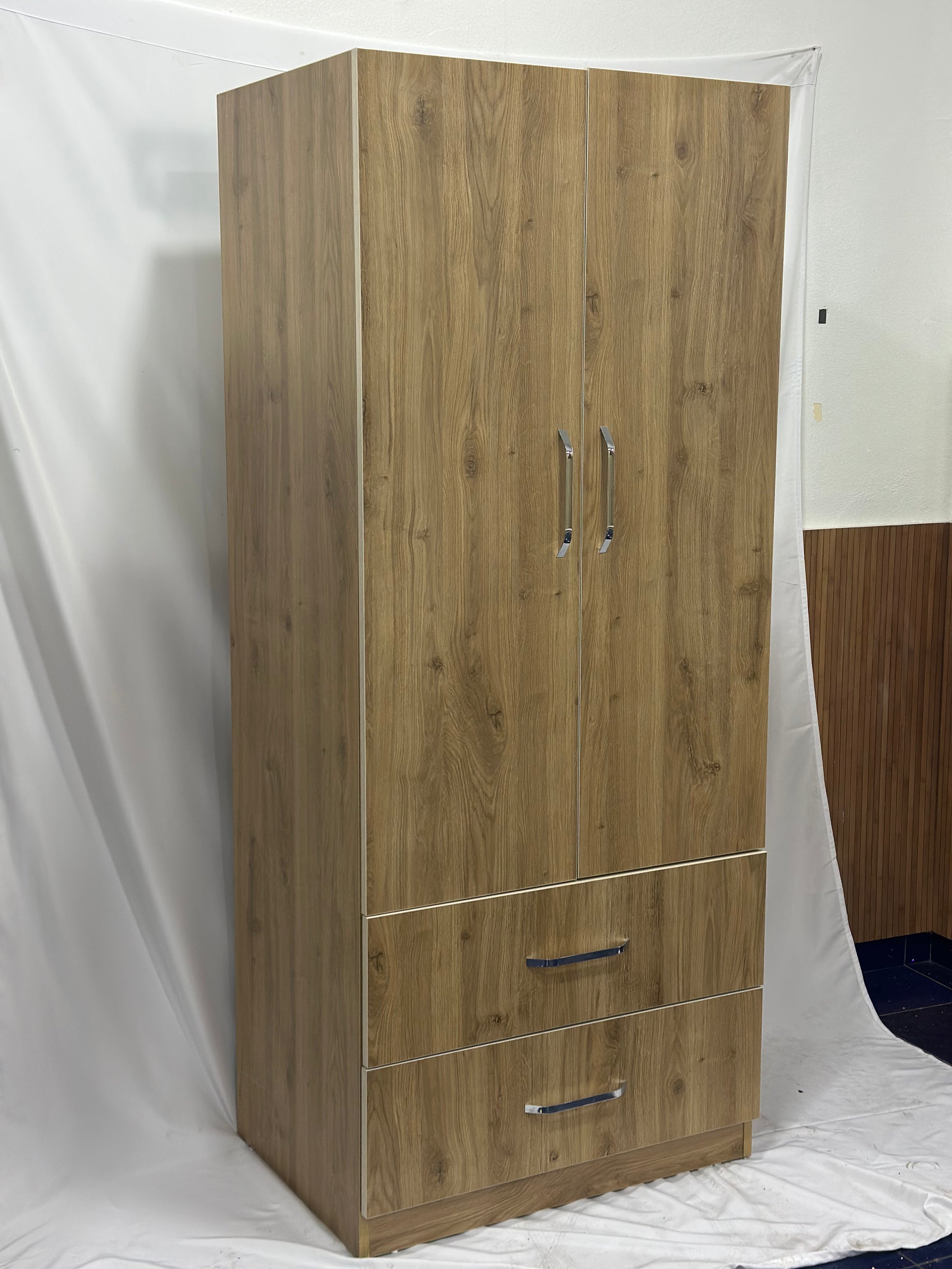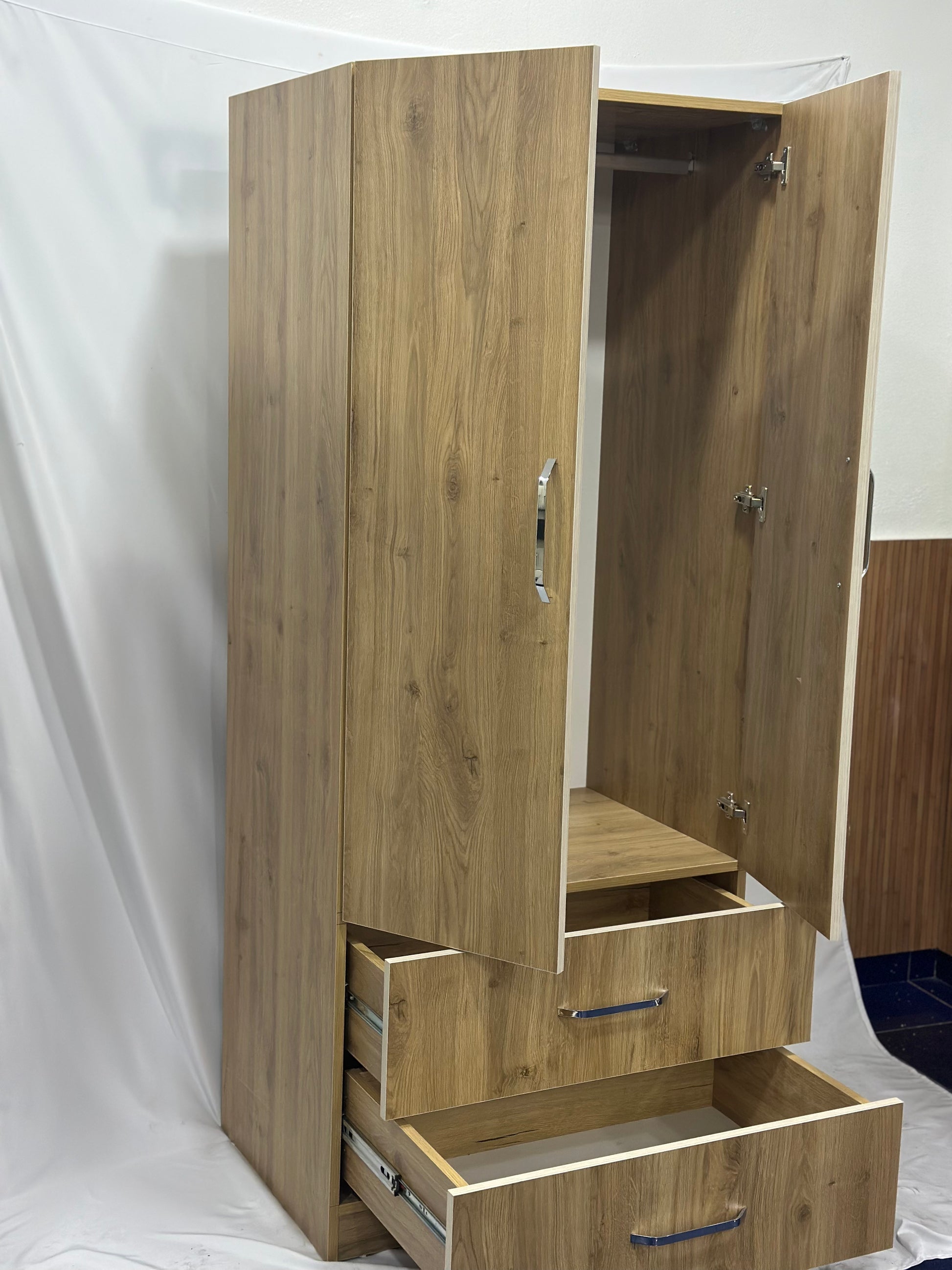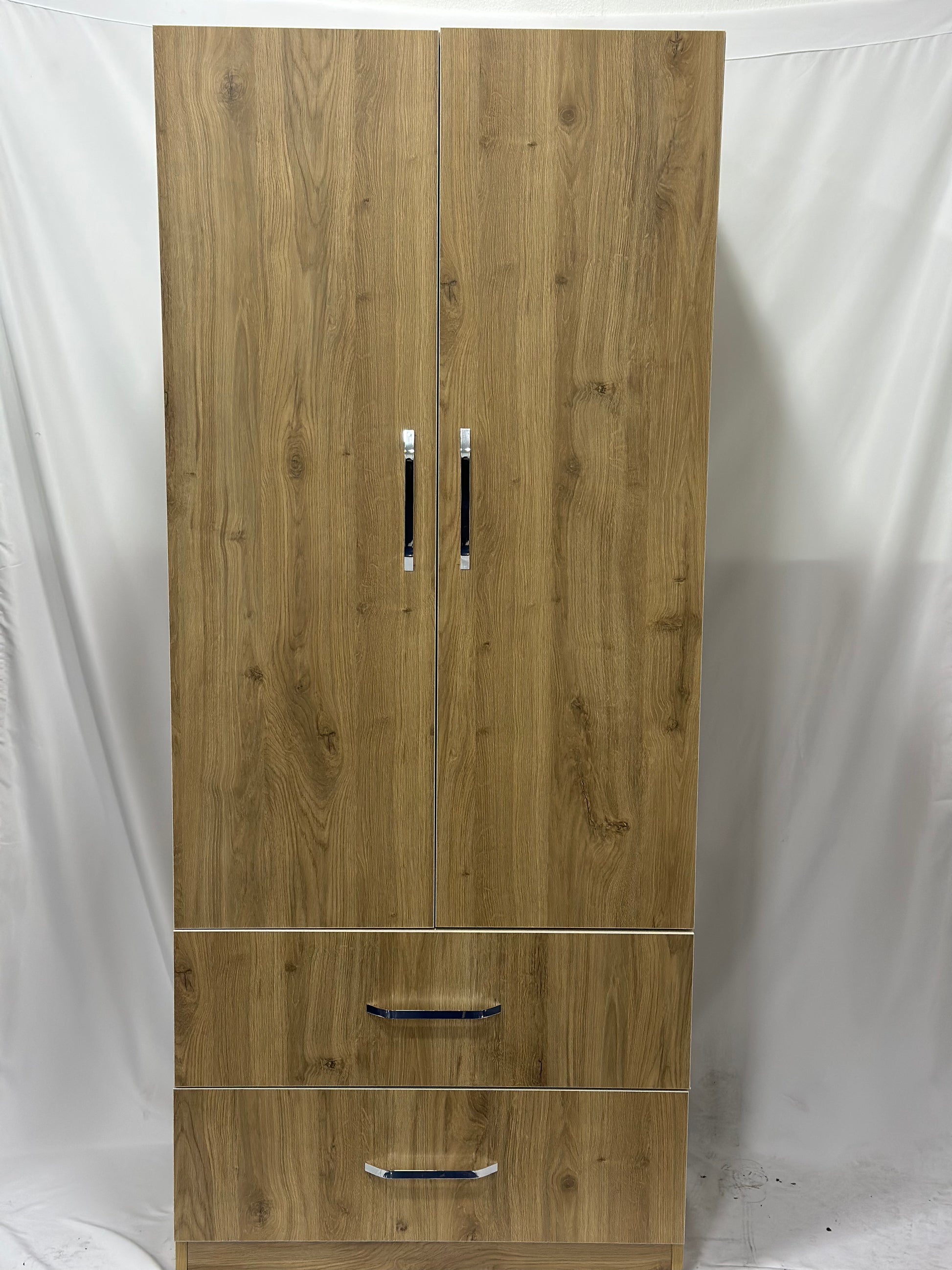 Funktionalität: Ausgestattet mit zwei Türen und zwei geräumigen Schubladen bietet dieser Kleiderschrank vielfältige Möglichkeiten zur Organisation Ihrer Kleidung und persönlichen Gegenstände.
